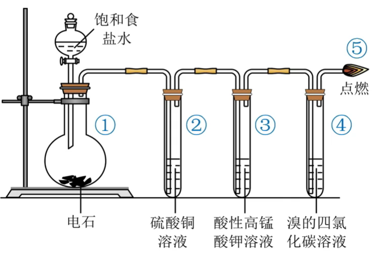 ⑤ 处对乙炔点燃,产生的现象为 火焰明亮,伴有浓烈黑烟(点燃前检验其纯度,防止爆炸)